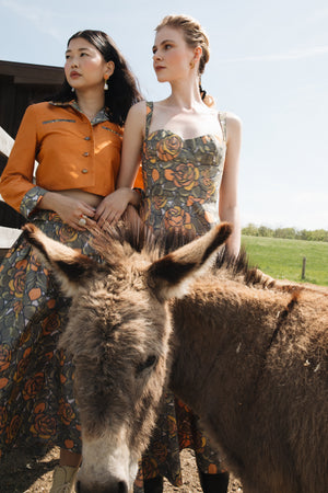 The Josephine Jacket is a statement piece that exudes both sophistication and versatility. This jacket showcases a cropped design. Crafted from luxurious rust silk shantung, it embraces playful contrasts with its distinctive hazy rose taffeta print on the collar and cuffs. This delightful detail injects a whimsical and feminine touch, elevating the overall aesthetic. Whether you choose to pair it with a stylish pair of jeans for a casual yet polished look or layer it over an elegant gown to make a grand entrance, this jacket effortlessly transitions from day to night, making it a versatile addition to your wardrobe.